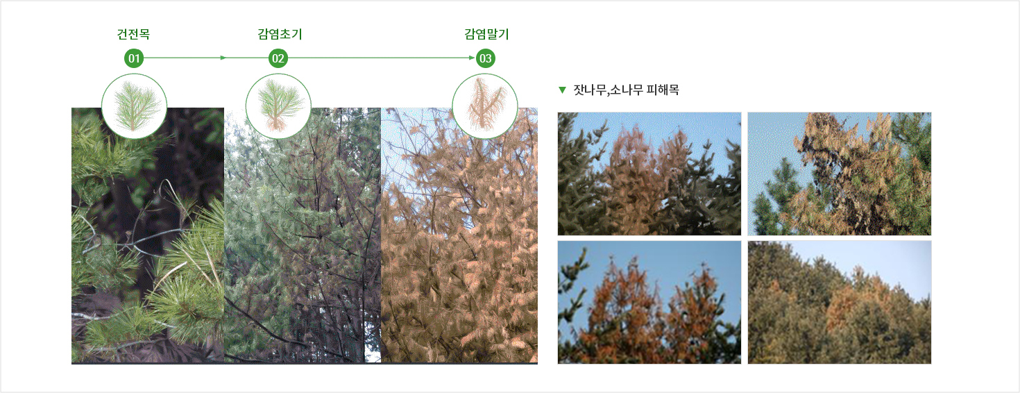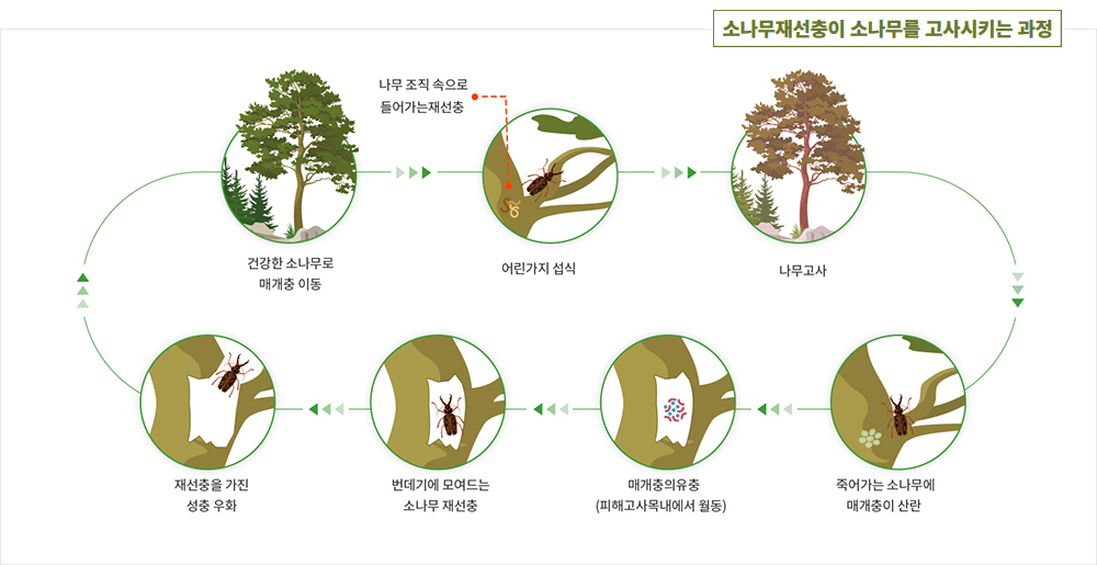 소나무재선충은 1㎜ 크기의 실 같은 벌레로, 솔수염하늘소나 북방수염하늘소 같은 매개충의 몸 안에 서식하다가 나무에 침입하는 산림 병해충이다. 재선충이 소나무류를 숙주로 빠르게 증식해 수분과 양분의 이동을 막으면 잎이 붉게 변하고 단기간에 나무가 시들어버린다. 소나무, 해송, 잣나무, 섬잣나무 등이 재선충에 감염되는데, 치료 방법이 없어 한 번 감염되면 100% 고사한다.