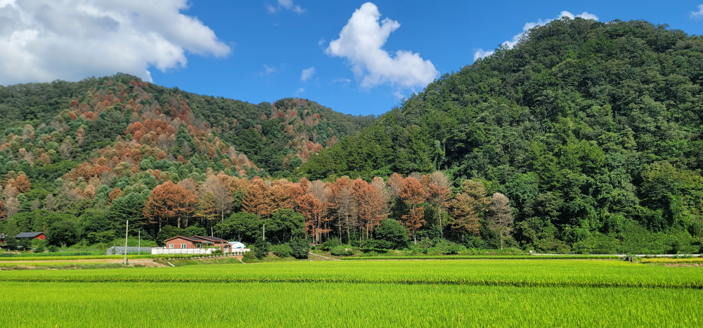 지난해 9월 촬영. 감염되지 않은 오른쪽 산은 초록빛을 보이지만, 소나무재선충병이 번진 왼쪽 산은 소나무가 연달아 고사하며 탁한 붉은 색으로 물들었다.