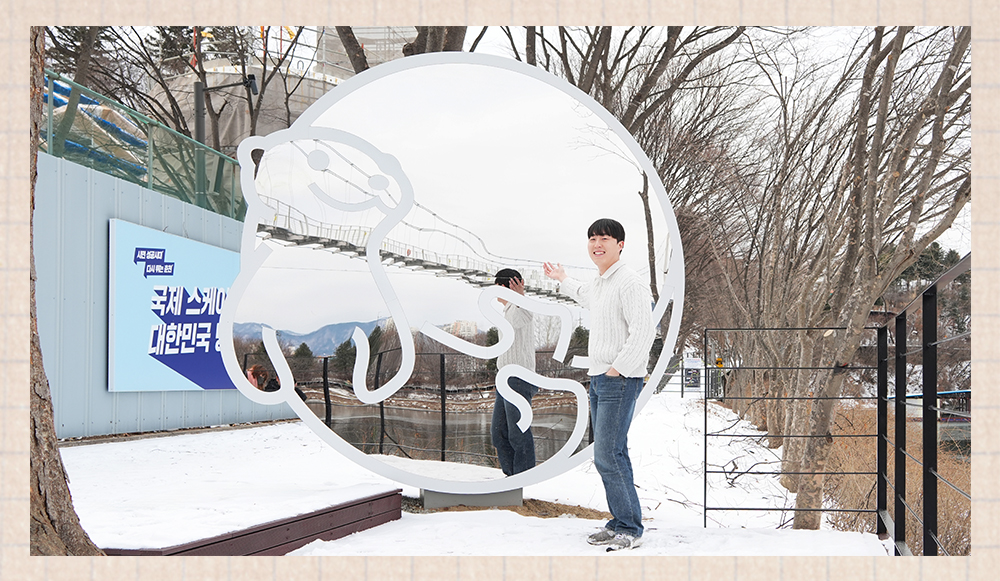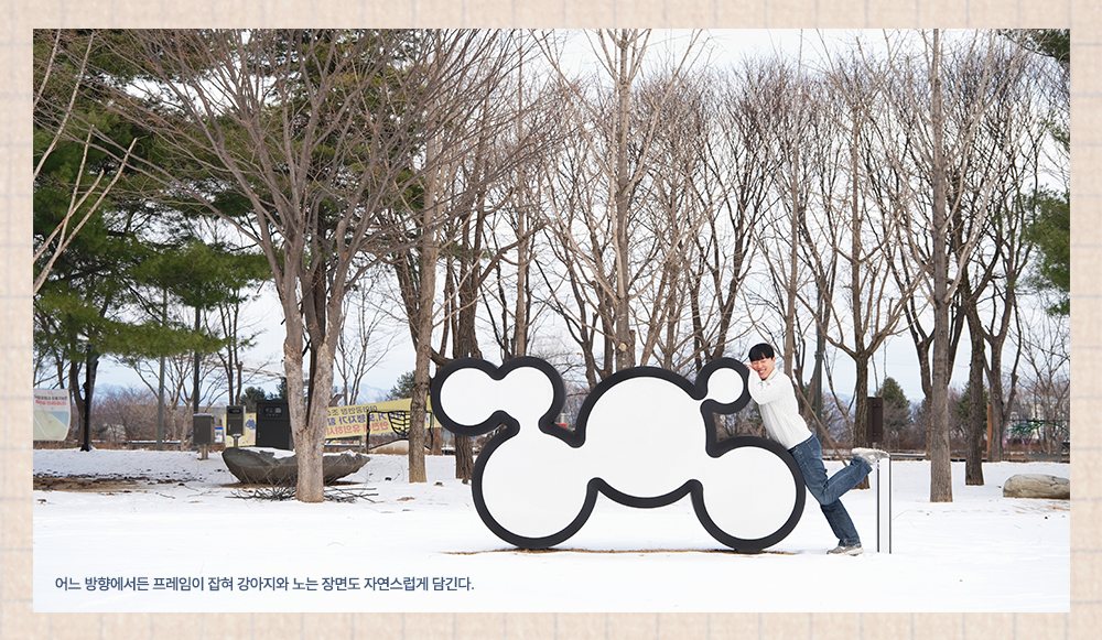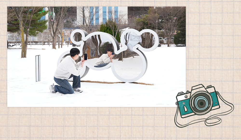 의암공원 한가운데 구름인지, 강아지인지, 물거품인지 모를 커다란 실루엣이 눈에 들어온다. 매끈한 곡선으로 이어진 형태 안쪽은 ‘오늘의 하늘색’을 그대로 비추는 반사판이고, 밖은 또렷 한 흰색 선으로 둘러쳐져 있다. 멀리서 보면 의암호 위에 떠 있던 구름이 하얀 잔디밭 위에 내려앉 은 듯하다. 가까이 서면 그 안에 겨울 호수와 숲, 사람까지 모두 담아내는 커다란 거울이 된다.