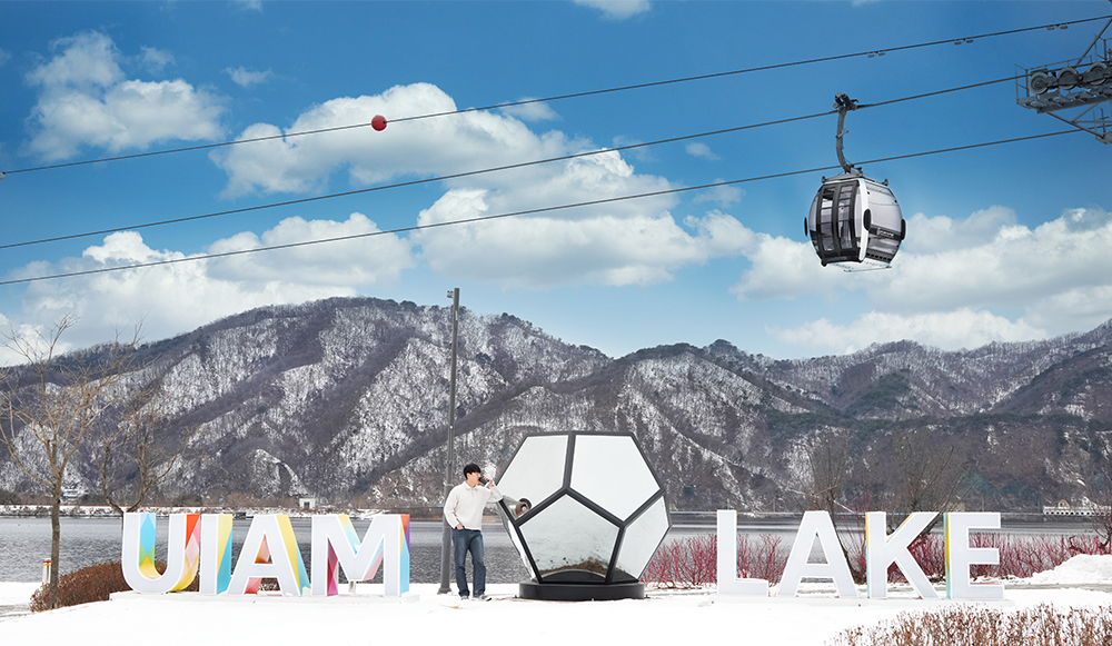 삼악산 케이블카와 스타벅스 의암호점 사이. 이번엔 길게 누운 구름 덩어리 같은 조형물이 나타난다. 여러 개의 물방울을 이어 붙인 것 같은 곡선을 따라, 안쪽은 매끈한 거울로 마감돼 있다. 가까이 서면 그 안에 삼악산의 설경, 케이블카 실루엣이 반사돼 하나의 풍경화처럼 비친다.