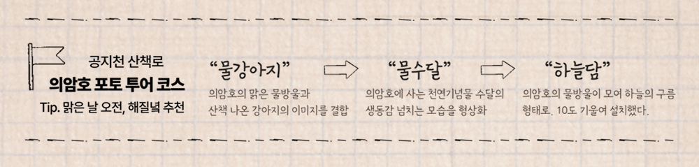 햇빛이 좋은 낮에는 구름과 파란 하늘이, 해 질 무렵에는 붉은 노을이 반사돼 그날의 공지천을 그대로 담아낸다. 사진 한 번 찍는 것만으로, ‘오늘의 날씨와 기분’이 통째로 저장되는 셈이다. 그래서 물강아지는 공지천 산책의 출발점이자, 여행자의 첫 인증샷 자리를 동시에 맡고 있다.