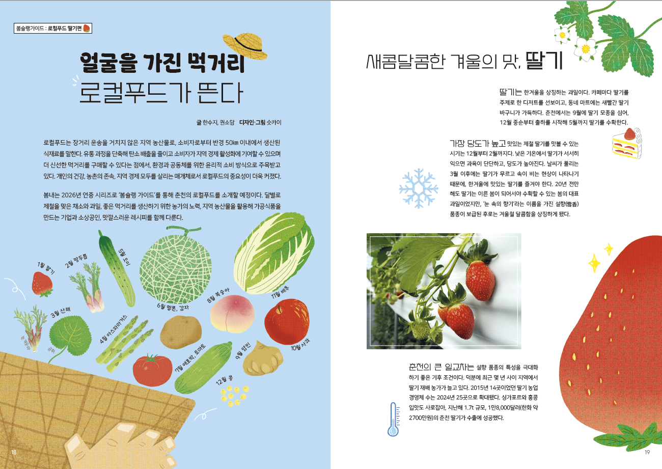 봄슐랭가이드가 올해는 로컬푸드 특집으로 개편했네요. 슷카이 작가님의 그림책을 좋아했는데, 봄내에서도 멋지게 활약하고 계셨네요. 언제봐도 따뜻한 슷카이 작가님의 일러스트와 열심히 취재하신 에디터님들의 노고가 고스란히 느껴지는 1월호였습니다.