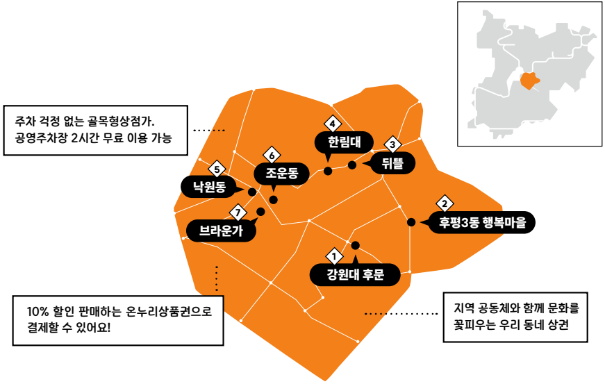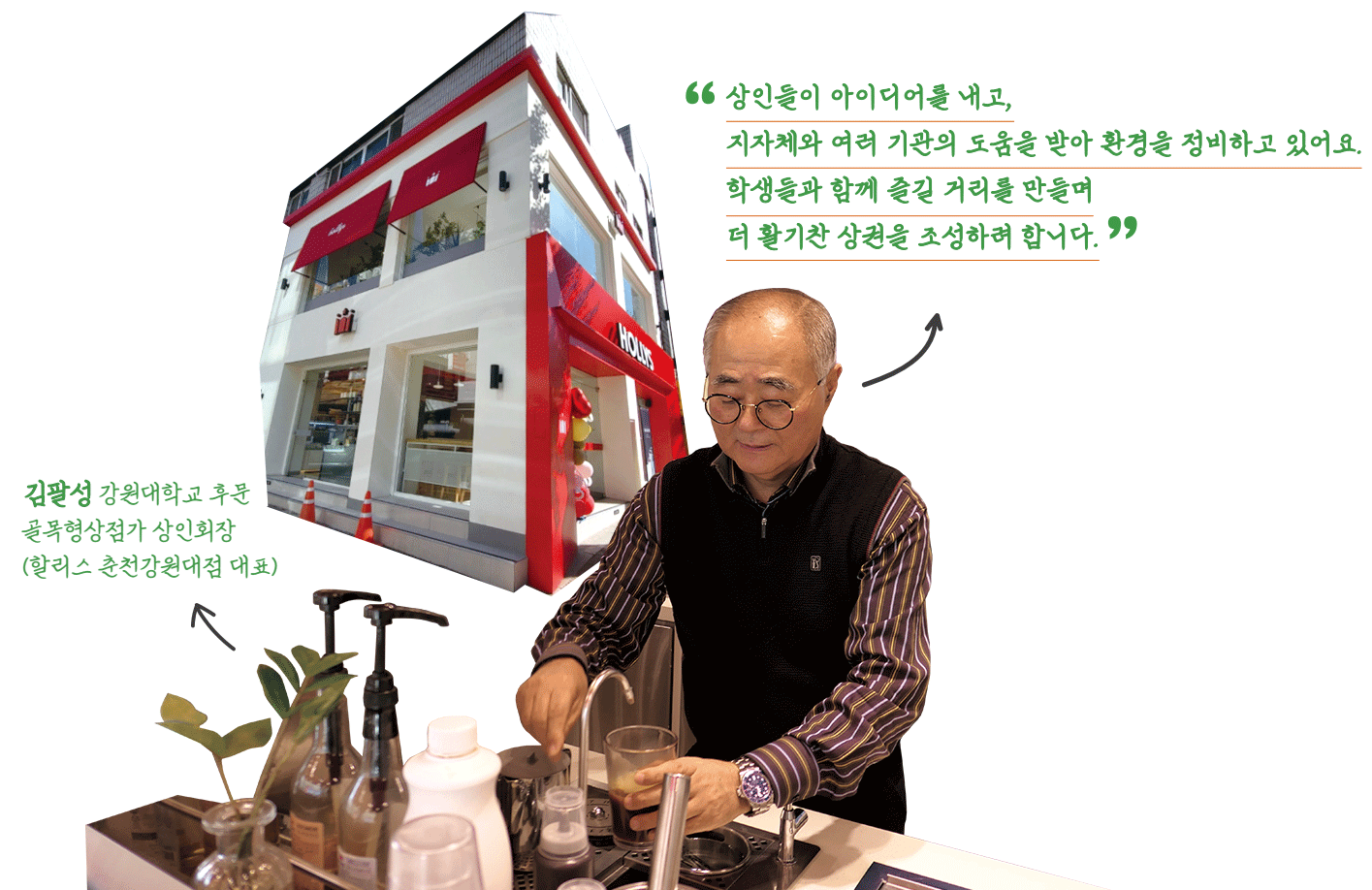 춘천시는 강원특별자치도와 함께 ‘강원형 골목상권 조성 사업’ 을 통해 이곳에 마케팅과 시설·환경 개선, 상인 역량 강화 등을 지원했다. 골목 가요제 같은 대학 연계 축제, 페이백 등 다양한 소비 촉진 캠페인을 벌인 결과, 강원대 후문은 대학생에게 사랑받는 근린 상권으로 거듭났다.