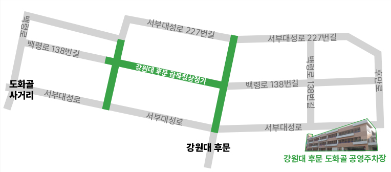 상권은 공영주차장 조성을 계기로 큰 변화를 맞았다. 춘천시는 설 연휴를 앞둔 12일부터 강원대 후문 도화골 공영주차장 운영을 시작했다. 주차장은 내년 1월 말까지 무료 개방할 예정으로, 주차난이 심각했던 상권의 활력소가 될 것이라는 기대가 크다. 무료 운영