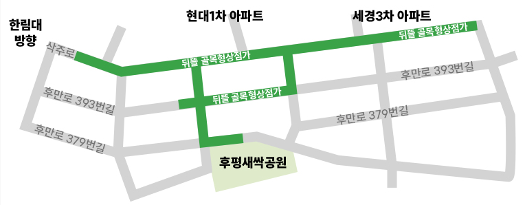 후평동 뒤뜰 상권은 코로나19 이후 대학 공동체와의 단절을 겪 으며 상권 자체가 흔들렸다. 하지만 2024년 9월 골목형상점가 지정을 계기로 분위기가 반전됐다. 여러 행사를 직접 기획하며 상권에 추억이 있는 옛 단골과 시민들을 끌었다. 한 자리에서 오래 영업한 토박이 상인들이 힘을 모아 ‘사람 냄새 나는’ 상권을 만들어 가고 있다.