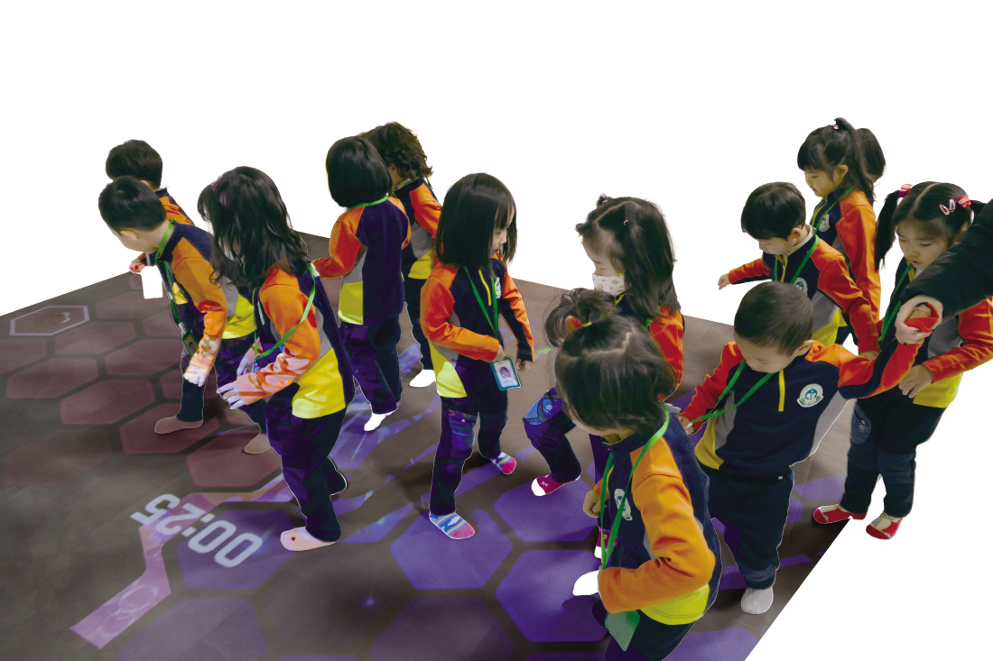명문유치원 냇물소리반 어린이들이 가장 즐거워했던 체험은 ‘디딤 놀이터’였다. 증강현실(AR)과 동작 인식 기술을 바탕으로 구현된 놀이터에서 발을 구르며 놀 수 있는 시설이다. 팀을 나눠 두더지 잡기를 시작하자 “꺅”하는 즐거운 비명이 들렸다. 뛰어 놀며 자연스레 민첩성과 하체 근육을 키우는 체험이다.