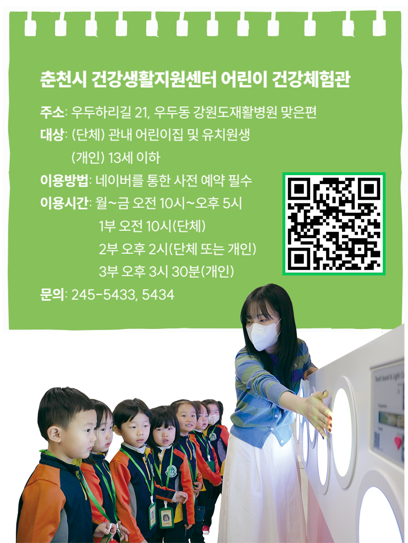 춘천시 건강관리과 관계자는 “디지털 환경에 익숙한 어린이들을 위해 동화 스토리텔링, 구강 보건 교육 등 맞춤형 콘텐츠를 운영하며, 건강과 재미를 동시에 잡을 수 있도록 노력하겠다”며 “건강한 생활 습관을 자연스럽게 배울 수 있으니 사전 예약을 통해 어린이 건강체험관을 많이 찾아달라”고 말했다.