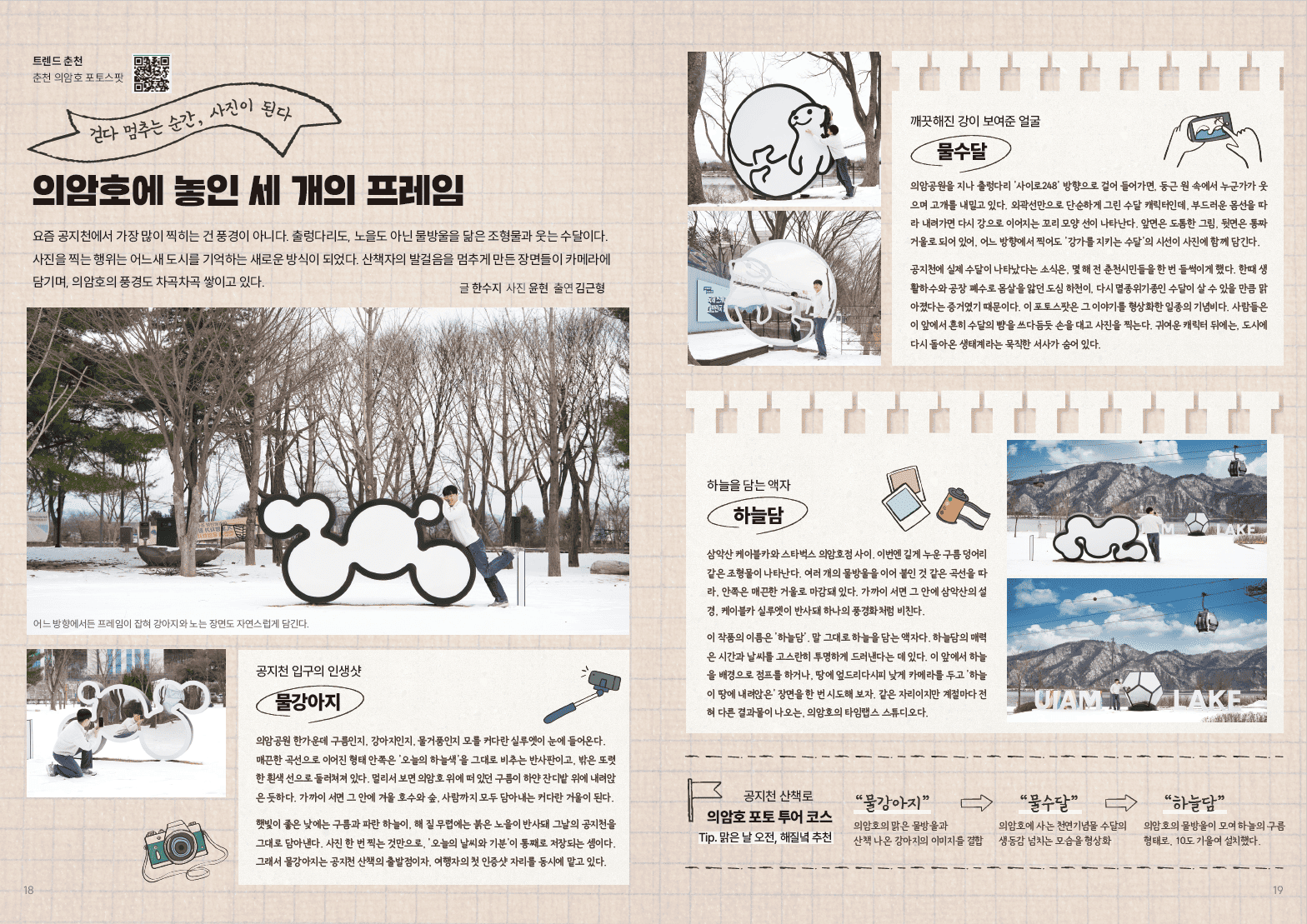 얼마 전 눈이 내렸던 날, 공지천을 산책하다가 물방울을 닳은 조형물을 보고 반가운 마음이 들었습니다. 봄내에서 봤던 물강아지였거든요. 강가를 지키는 물수달까지 천천히 걸어가 보았습니다. 그날의 날씨와 기분이 통째로 저장된 것만 같은 하루였습니다.