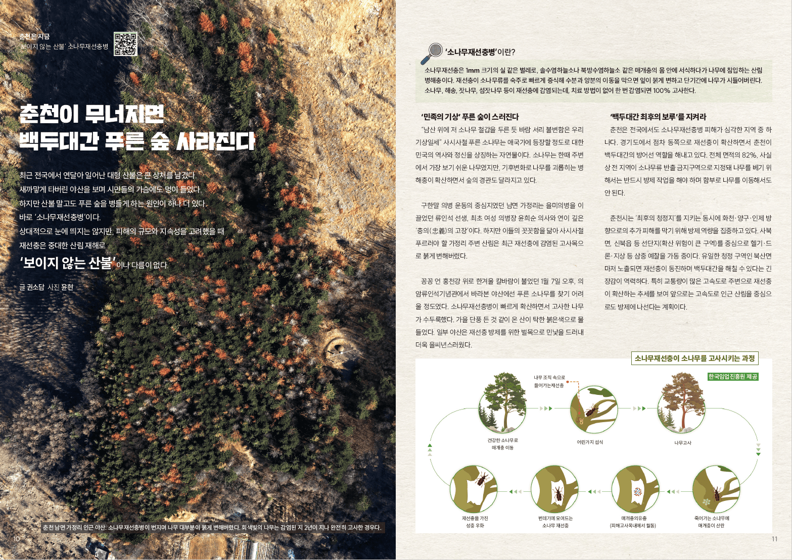 숲에도 눈에 띄지 않는 재난이 있다는 걸 알게 됐다. 작은 벌레 하나가 소나무를 말라죽게 하고, 산의 풍경까지 바꾼다는 사실이 놀라웠다. 겉으로 멀쩡해보이는 숲일수록 더 세심한 관심이 필요하다는 걸 다시 한 번 느꼈다. 일선에서 수고하시는 공무원들 화이팅!