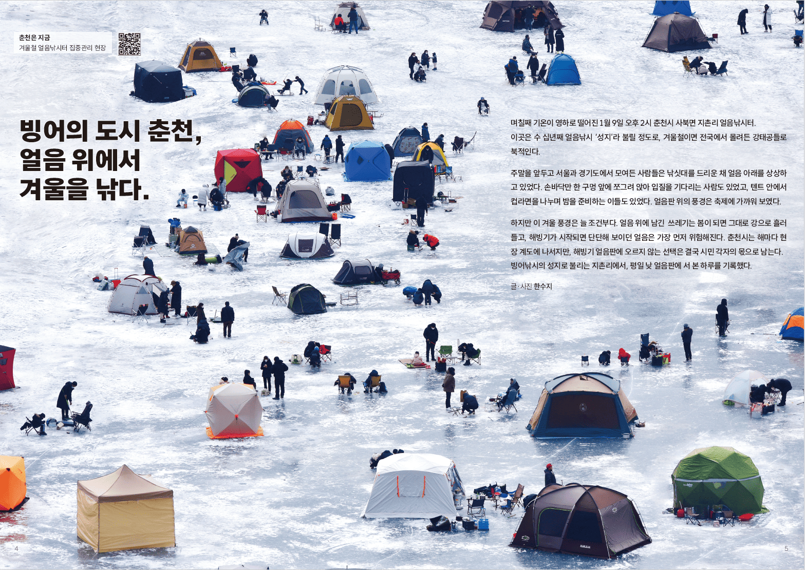 첫 기사부터 사진이 참 멋집니다. 빙어낚시의 즐거움이 생생하게 전해져, 마치 직접 낚시를 하는 듯한 느낌을 받았습니다. 즐거움 뒤에서 묵묵히 애쓰시는 공무원들의 이야기와 안전관리 내용까지 담겨 있어, 더욱 유익한 기사였습니다. 빙어낚시를 통해 춘천의 또다른 멋을 느낄 수 있었습니다.