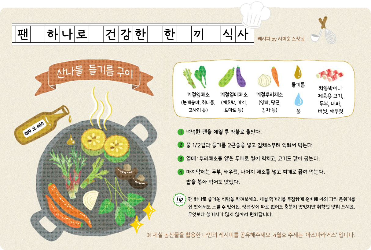 | 산+마늘, 야생 마늘이라는 뜻에서 온 이름으로 ‘명이’라고도 부른다. 마늘 향이 은은하게 나며 줄기 하나에 잎이 두 장씩 달린다. 쌈이나 장아찌, 무침으로 즐긴다. |