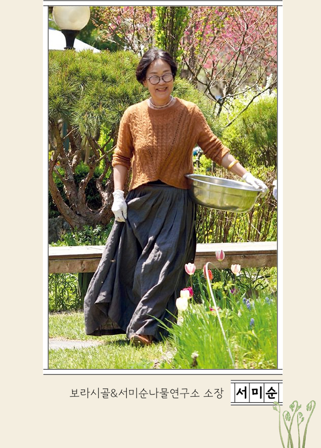 서 소장은 1997년 춘천에 정착했다. 봄이면 곰취가 올라오고 두릅이 가지 끝을 밀어 올리고, 눈개승마가 솜털을 털며 고개를 드는 곳이었다. 지천에 널린 산나물이 좋아 나물을 공부하기 시작했고, 결국 ‘나물연구소’를 열었다. 춘천산 식재료와 4,958㎡ (1500평)규모의 정원에서 채취한 나물을 자연주의 방식으로 조리해 건강하게 먹는 법을 연구하고 있다.
