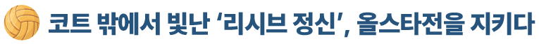 1월 25일, 호반체육관에서 열린 ‘2025~2026 V-리그 올스타 전’의 성공적인 개최 뒤에는 춘천 배구 동호인들의 숨은 땀방울이 있었다. 각 클럽에서 자발적으로 모인 12명의 봉사단은 축제의 조연을 자처했다. 전경숙 춘천시배구협회 전무이사가 장비 매니저로, 이기호 전 전무이사가 코트 매니저로 나서 현장 실무를 도맡았다. 이들은 네트 설치부터 경기장 바닥 청소, 장비 점검 등 가장 고된 곳에서 묵묵히 움직였다. 배구를 사랑하는 마음 하나로 뭉친 이들의 헌신 덕분에, 춘천을 찾은 전국의 배구 팬들은 쾌적한 환경에서 경기를 즐길 수 있었다. 춘천이 진정한 ‘배구 도시’임을 증명한 순간이었다.