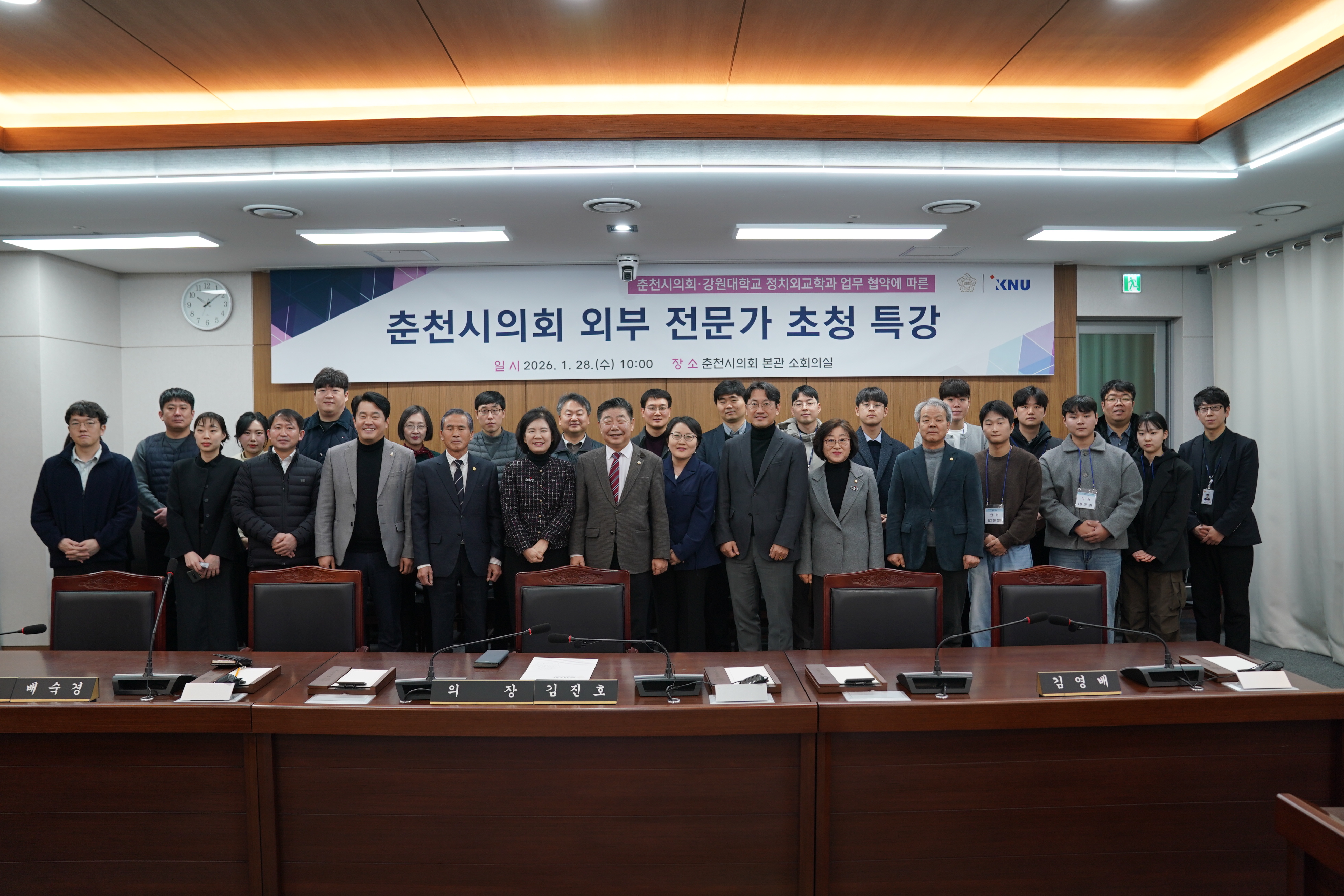 춘천시의회(의장 김진호)는 1.28.(수) 의회 소회의실에서 ‘외부 전문가 초청 특강’을 개최했다. 이번 특강은 춘천시의회와 강원대학교 정치외교학과 간 업무협약을 계기로 마련된 자리로 지방의회의 역할 강화와 제도 개선 방향을 모색하기 위해 추진됐다.