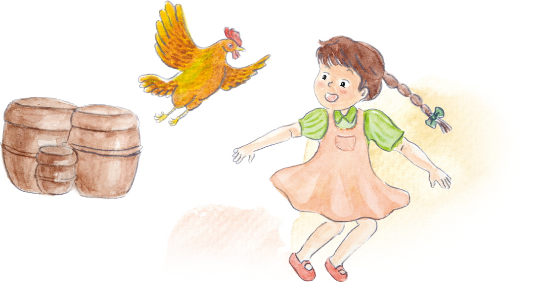 여름 방학에 외삼촌의 딸 나영이가 우리집에 놀러왔다가 마당 장독대 계단으로 뛰어올라가더니, 장독대에서 담장 밖으로 펄쩍 뛰어내렸다. 그때, 멀쩡한 대문을 놔두고 담장을 이용해 집 밖으로 뛰쳐나가는 나영이의 모습을 말없이 지켜보는 존재가 있었다. 닭들이었다.