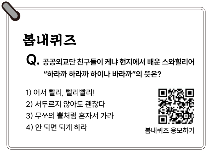 최인숙 춘천시 국제협력관은 “아이들이 케냐에서 배우고 느낀 것을 다시 우리 지역에 전하는 것까지가 공공외교의 중요한 과정”이라며 “앞으로도 청소년들이 다양한 나라와 교류하며 성장할 수 있도록 프로그램을 이어갈 계획”이라고 말했다.