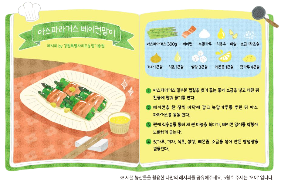 아스파라거스의 변신은 무궁무진하다. 콩나물과 비슷한 향이 나 채소를 활용하는 그 어떤 요리에도 활용할 수 있다. 대중적으로는 볶아서 스테이크와 곁들여 먹는다. 카스텔라, 에그타르트를 만들 때 베이킹 재료로도 사용한다. 데쳐서 초고추장에 찍어 먹고, 카레나 짜장밥을 만들 때도 쓴다. 특유의 아삭한 식감 덕에 제육볶음과도 잘 어울린다.