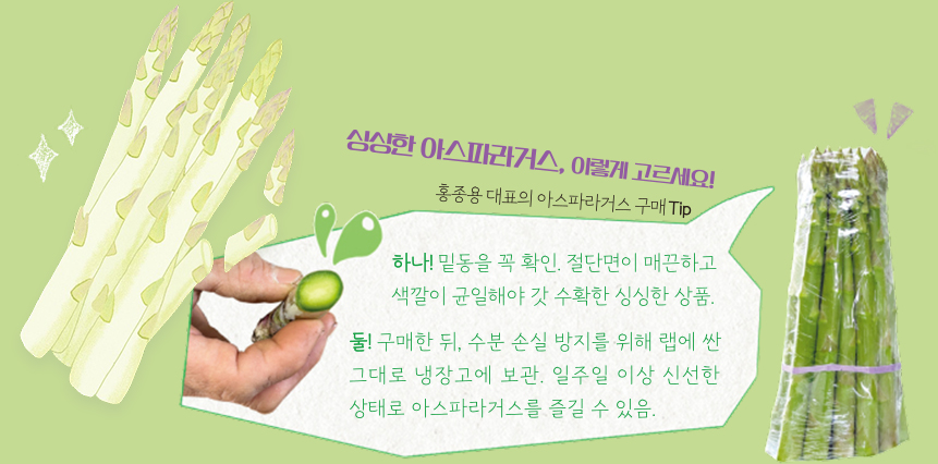 홍 대표는 1300평(약 4300㎡) 규모의 하우스에서 아스파라거스를 재배한다. 수확 시기에도 다른 손을 빌리지 않고 아내 이정희(66) 씨와 단둘이 작업한다. 성장이 가장 활발한 때엔 하루 60~100kg씩 수확량이 쏟아진다. 그는 젊은 시절부터 농촌 운동에 적극적으로 나서며 서면을 통합하는 작목반을 만들었다. 지금도 신매2리 이장을 맡고 있다. 지역사회를 위해 헌신하는 성실함이 드러나는 대목이다.