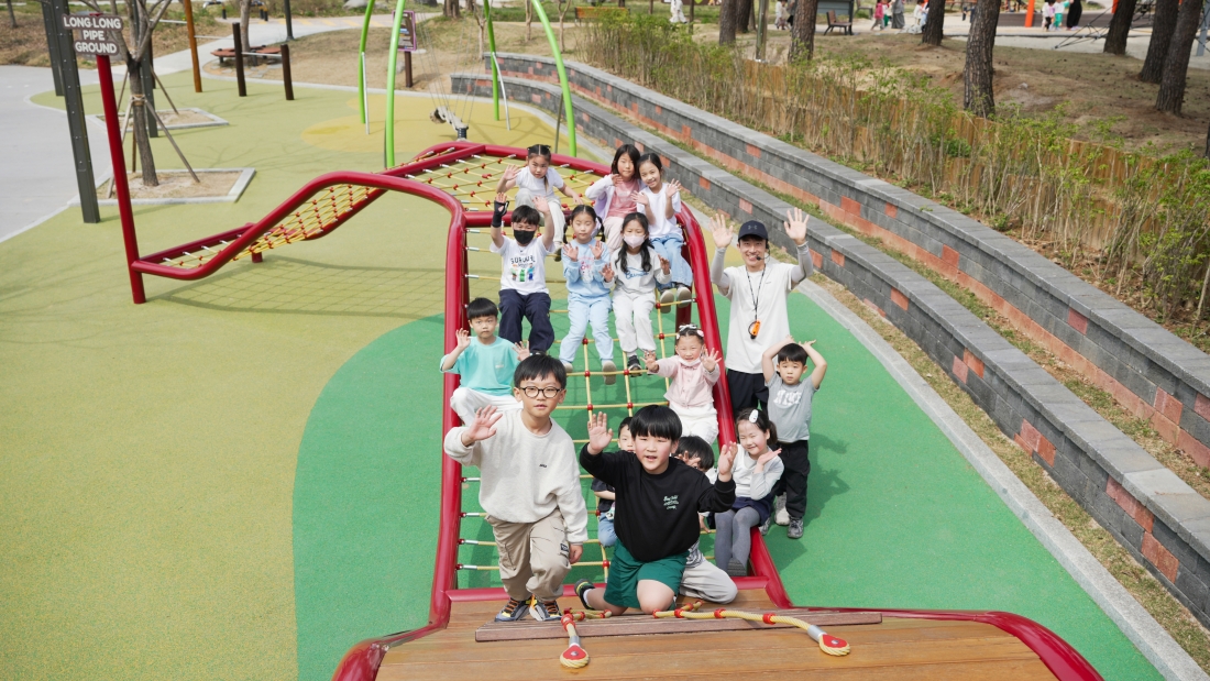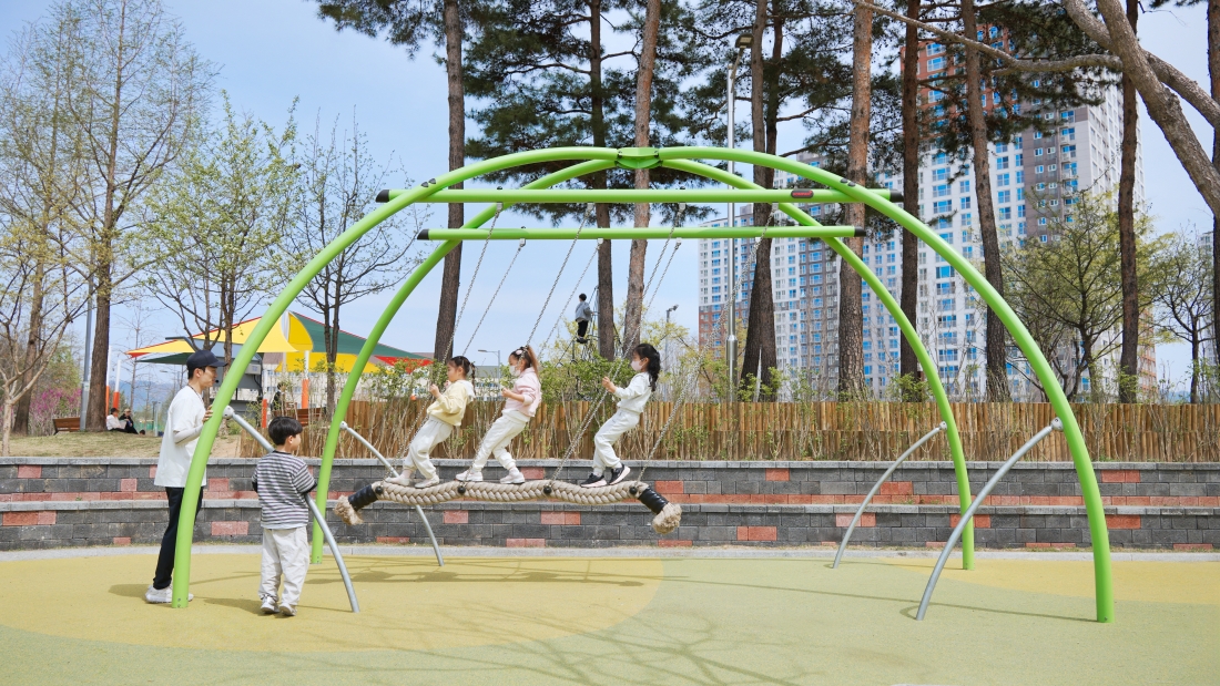 연두색 아치가 하늘을 향해 열려 있고, 나무 결이 살아있는 놀이기구 사이로 소나무 그늘이 드리운다. 말랑한 우레탄 바닥은 초록·노랑·파랑으로 물들어 있다. 누군가 일부러 ‘아이의 속도’에 맞춰 배치해 둔 듯한 이 공간을, 아이들은 금세 자기들만의 도시처럼 점령한다. 아이들이 오기 전부터 낙엽을 쓸고 장난감을 씻어두던 김종옥 놀이터 안전지킴이는 분필 대신 빗자루를 든 또 다른 담임 선생님 같다.