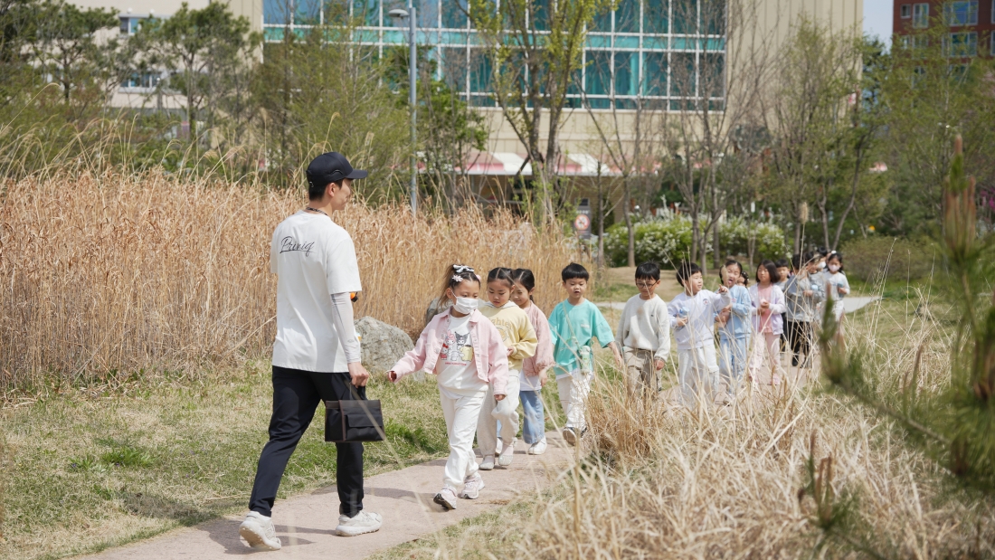 4월 14일 오전, 신동초등학교 후문에서 아이들이 줄지어 걸어 나 왔다. 1학년 3반 강신명 선생님의 체육시간, 오늘의 교실은 운동장 이 아니라 학교 바로 옆 톡톡놀이터다.