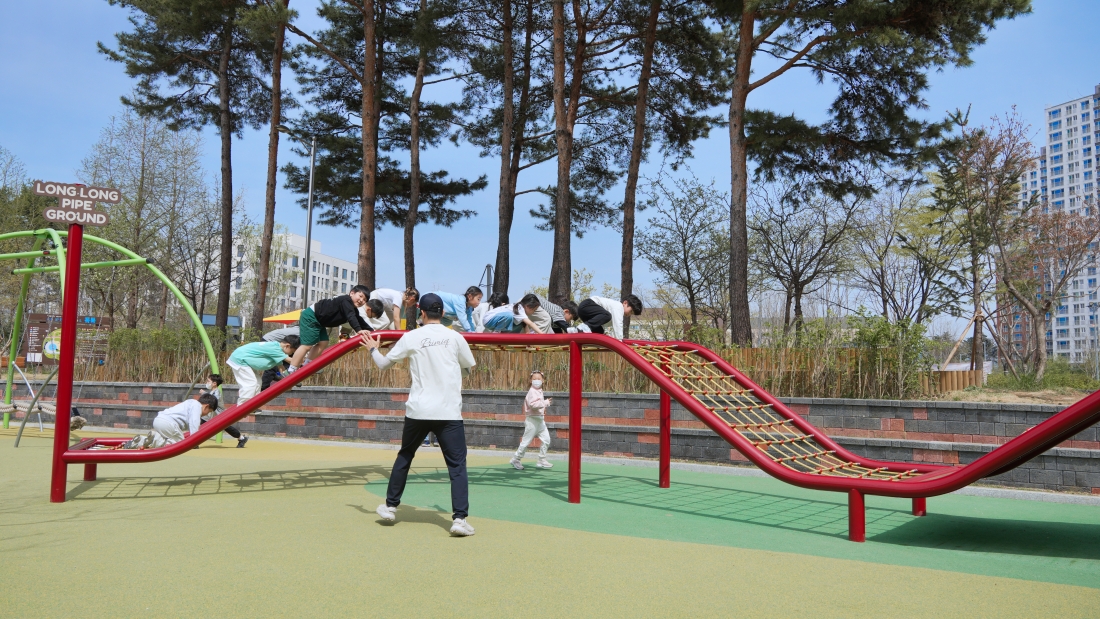 톡톡놀이터는 춘천시가 2021년부터 조성해온 ‘봄내림놀이터’의 세 번째 작품이다. 1호 ‘잼잼’(동내면 거두리, 2021), 2호 ‘솔솔’ (퇴계동, 2023)에 이어 우두동에 자리를 잡았다. 이곳이 다른 놀이터와 결정적으로 다른 점은 하나다. 아이들이 직접 만들었다는 것. 조성 단계부터 아이들이 디자인 워크숍에 참여했다. 현장을 직접 걷고, 모형을 만들고, 역할을 나눠 자발적으로 의견을 냈다. 아이들의 요구는 구체적이었다. 그물형으로 타고 오르는 놀이시설, 여러 명이 함께 타는 그네와 모래놀이까지. 그물놀이터는 레고랜드 놀이기구를 본 아이의 아이디어에서 시작됐다. 집라인처럼 현실적으로 반영이 어려운 의견은 조율됐지만, 아이들의 상상이 설계도의 출발점이 됐다는 건 달라지지 않았다. 놀이터 한켠 현수막 에는 함께 만든 이들의 이름이 걸려 있다. 놀이터협의체, 디자인학교, 어린이감리단.