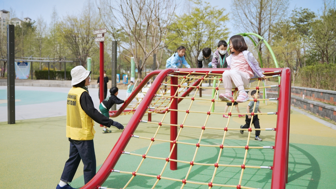 선생님은 아이들을 큰 나무 그늘 아래 모았다. 손에는 바른생활 1-1 교과서. 오늘의 주제는 ‘안전하게 놀아요’다. “여기 많이 와 봤지? 근데 반 친구들이랑 다같이 놀아본 적은 없잖아. 방과후 수업이나 학원 가느라.” 아이들이 고개를 끄덕였다. “오늘은 안전하게, 배려하면서 같이 뛰어노는 거야. 호루라기 세 번 불면 다시 여기로 모여요.” 그 말이 끝나기 무섭게 아이들이 흩어졌다. 누군가는 암벽을 타고, 로켓그물망에 매달리고, 미끄럼틀을 올라갔다 내려오기를 반복했다. 강 교사는 철봉, 숲놀이터, 다인그네 사이를 오가며 아이들을 살폈다. 수업 막바지, 강 교사가 아이들을 미끄럼틀 그물놀이대 앞에 모았다. 한 명씩 그물을 타고 올랐다. 아이들은 먼저 올라가 보고, 매달려 보고, 내려오면서 스스로 규칙을 만들었다. 그물 사이를 기어가며 친구에게 길을 터주는 아이도, 위에서 기다리는 친구에게 손을 내미는 아이도 있었다.