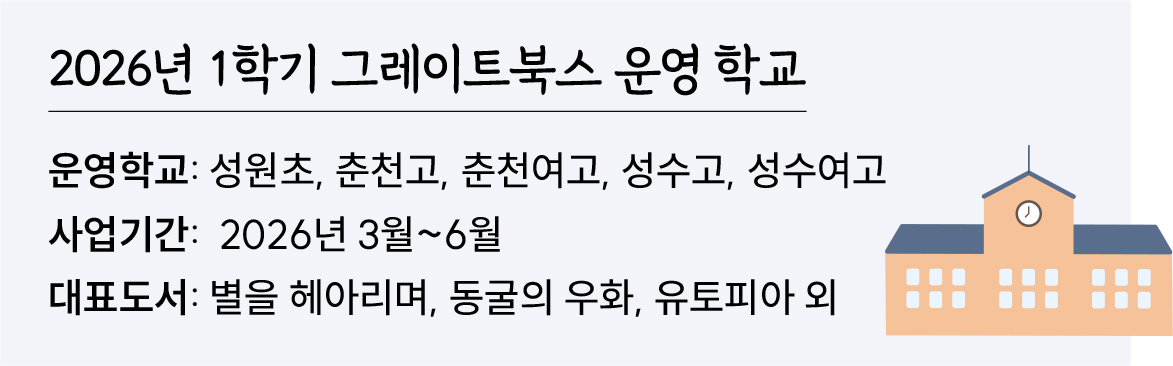 그레이트북스(Great Books)는 미국 세인트존스대학의 고전 읽기 토론 프로그램에서 출발했다. 춘천시와 강원도특별자치교육청, 세인트존스대학의 협업으로 운영되며, 지자체와 대학이 함께 도시 단위로 그레이트북스를 확산하는 국내 첫 모델이다. 수업 방식은 단순하다. 같은 책을 읽고, 원형으로 앉아, 질문을 던지며 대화한다. 정해진 정답은 없고, 선생님도 답을 주지 않는다.