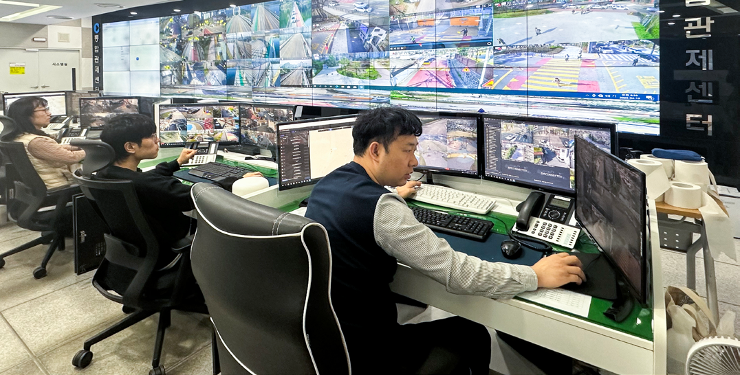 4월 13일 월요일 오전, 춘천시청 지하 1층 재난안전담당관실 통합관제센터. 대형 모니터에는 춘천 시내 교량과 골목 화면이 가득하다. 소양강 위를 지나는 차들, 인적 드문 이면도로. 8시가 되면 그 사이로 학교 앞 화면들이 올라온다. 장학초, 신동초, 춘천초, 춘천계성학교, 춘천동원학교, 오동초. 담당자는 그 화면들을 번갈아 살피며 아이들이 교문 안으로 다 들어갈 때까지 자리를 지킨다. 8시 40분쯤, 교차로를 건너는 학생들이 가장 많아지는 시간이 되면 시선이 모니터에 더 붙는다. 박동우 주무관은 “이 시간대가 제일 신경 쓰여요”라고 했다.