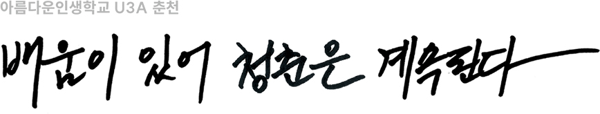 춘천에서도 자발적인 움직임이 본격화됐다. 아름다운인생학교 U3A 춘천(이하 ‘춘천인생학교’)은 올해 3월 개교식 이후 5개 강의로 1학기를 시작했다. 한림대 금융재무학과 객원교수로 은퇴 설계를 강의하는 이덕수 교장이 영국 U3A를 접한 뒤, 학습 모임을 추진한 것이 계기였다. 은퇴자들이 건강하게 노후를 보내기 위한 ‘진입 장벽 없는 마을학교’를 만들고자 했다.