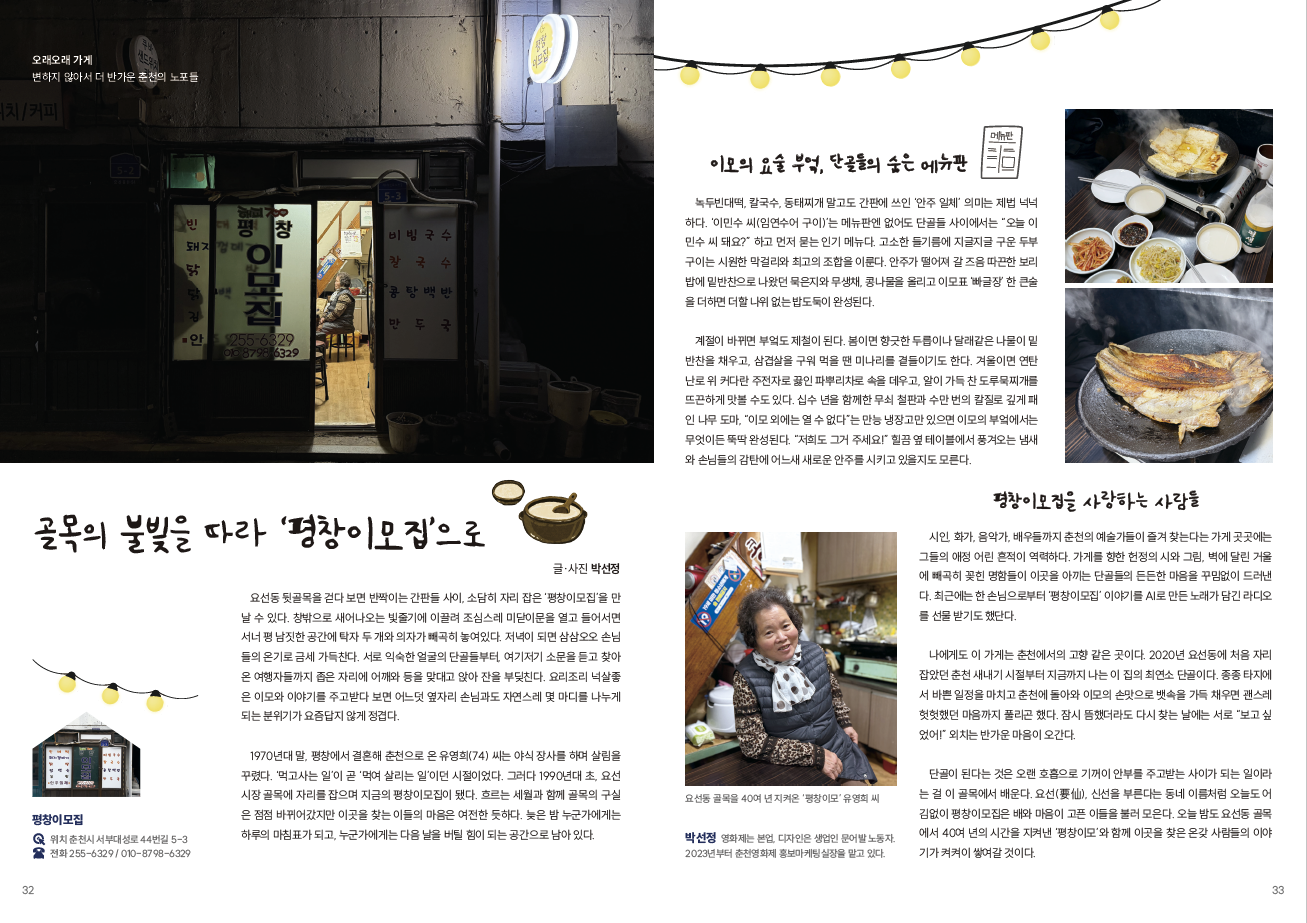 봄내를 통해 요선동 ‘평창이모집’ 같은 정겨운 가게를 만나 기쁩니다. 새로 알게 된 맛집에서 음식을 즐기는 계기가 됐습니다. 로컬 식당들 이 계속해서 활기를 띨 수 있도록 이 코너가 꾸준히 이어지길 응원합니다.