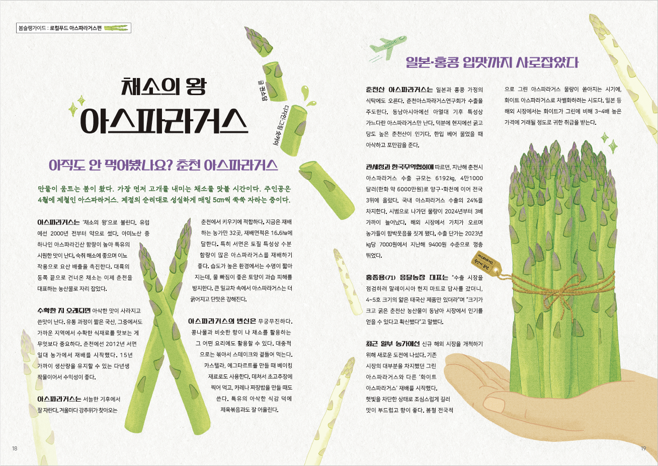 마트에 가면 아주 짧은 기간에만 볼 수 있는 몸 값 높은 수입 채소인줄 알았습니다. 그런데 15년째 춘천에서 재배하고 있는 고부가 가치 농산물이라는 사실에 놀랐어요. 레시피를 참고해 가족들과 맛있는 아스파라거스 요리를 먹었답니다. 춘천의 농부들 덕분에 매일 건강해지는 기분입니다.