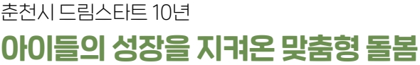 어려운 상황에 놓인 어린이라면 ‘드림스타트’를 통해 누구나 맞춤형 지원을 받을 수 있다. 위기 아동이 건강하고 바르게 자랄 수 있도록 함께하는 춘천시의 대표 아동복지 정책이다. 보건복지부가 총괄하고, 지자체가 현장에서 운영하는 공적 돌봄 체계다. 취약계층 아동과 가족을 대상으로 건강·교육·정서·가족 분야 맞춤형 통합서비스를 제공한다. 춘천시 드림스타트는 지난해로 꼭 10년이 됐다. 2015년 강북지역에서 시작해, 2019년부터 전 지역을 대상으로 사업을 확대했다.