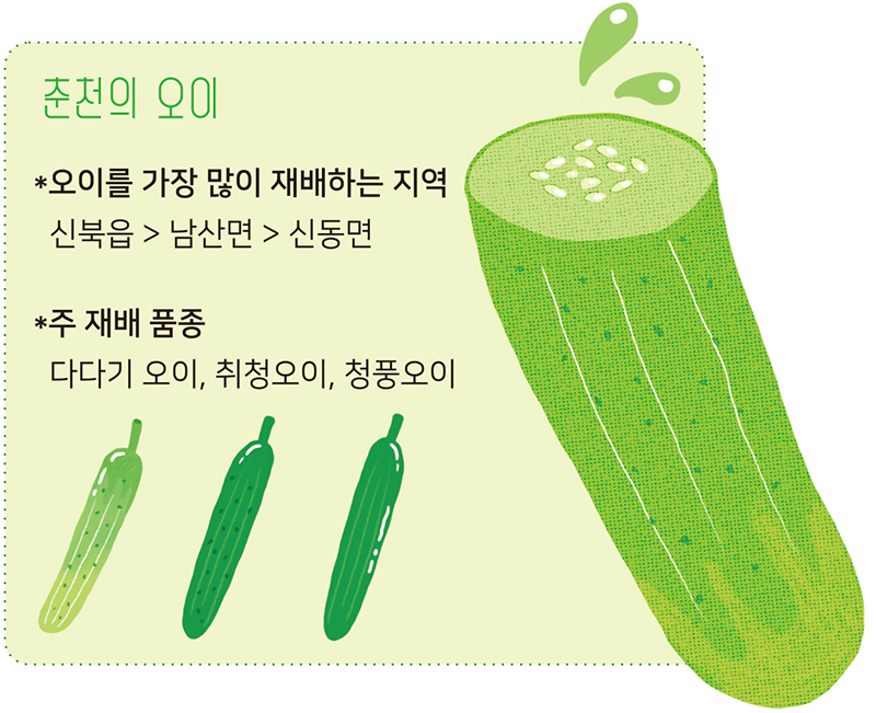 춘천 전역에서 370여 농가가 오이를 재배한다. 그중 남산면은 춘천 전체 오이 재배 면적의 4분의 1을 차지하는 대표 산지다. 같은 춘천이지만 남산면의 아침은 더 차갑다. 시내보다 기온이 낮고, 4월 초에도 영하를 기록하는 날이 많다. 매실이 냉해를 입고, 목련이 채 피기도 전에 상하는 이유도 여기에 있다. 난방 없이 자연 온도에 의존하는 농가들은 그래서 4월 중순을 넘겨야 모종을 심는다. 늦게 심는 만큼 더 단단하게 자란다. 5월에서 10월까지, 일교차가 큰 남산면의 땅에서 자란 오이는 단맛이 깊고 아삭함이 오래 간다.