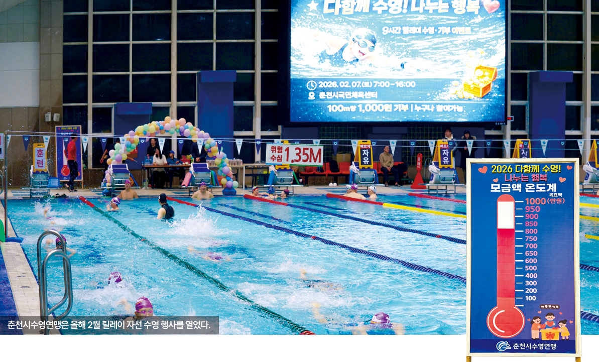올해 2월 춘천시수영연맹이 개최한 ‘제11회 릴레이 자선 수영 행사’ 풍경이다. 이날 지역 동호인과 시민 300여 명이 모여 9시간 동안 레인을 채웠다. 100m 완주할 때마다 1,000원씩 기부금을 적립해 1,062만 2,000원의 성금을 모았다. 연맹은 지역 소외 계층을 위해 써달라며 기부금 전액을 춘천시에 전달했다.