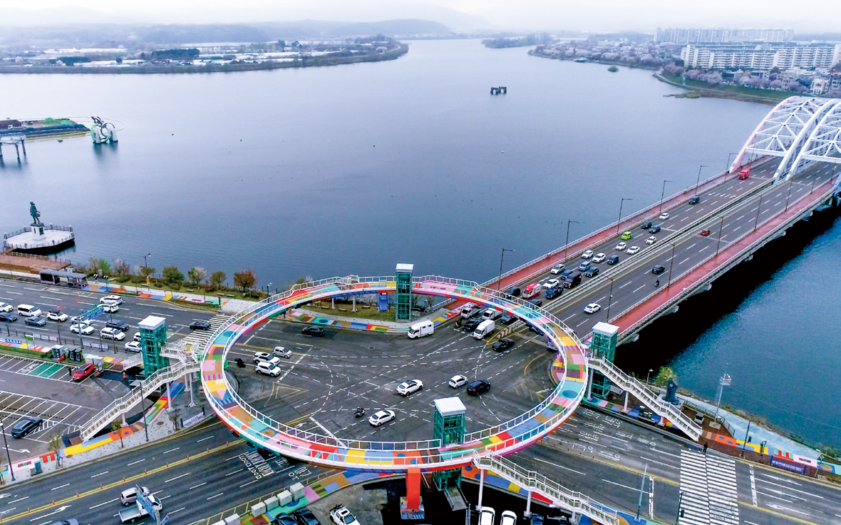 소양아트서클은 보행자 편의와 예술적 경험을 위해 호반사거리에 조성한 원형 형태의 육교입니다.